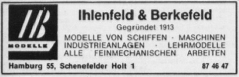 Die Firma Ihlendfeldt & Berkefeld wurde im Jahre 1913 gegründet, d.h. es werden hier seit 60 Jahren feinmechanische Modelle aller Art gefertigt. 60 Jahre Modellbau - das bedeutet einen unschätzbaren Fundus an Erfahrungen, der letztendlich dem Kunden zugute kommt. Das bedeutet aber auch eine Vielzahl durch qualitativ hochwertige und termingerechte Lieferungen zufriedengestellter Kunden.